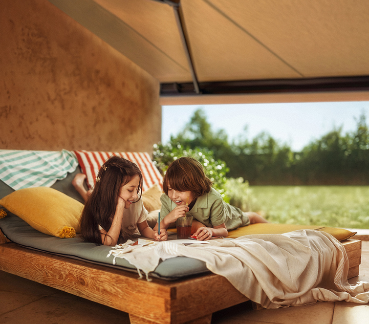 Somfyn älykkäiden ratkaisujen avulla saat ulkotiloistasi kaiken irti vaivattomasti. Markiisi mukautuu säähän, suojaten lapsiasi auringolta ja vetäytyen myrskyn aikana. Kesäiltoihin voit luoda TaHoma-sovelluksessa skenaarioita, joilla ohjaat pergolaa, valaistusta ja musiikkia, täydellisiä illallisia varten ystävien kanssa.